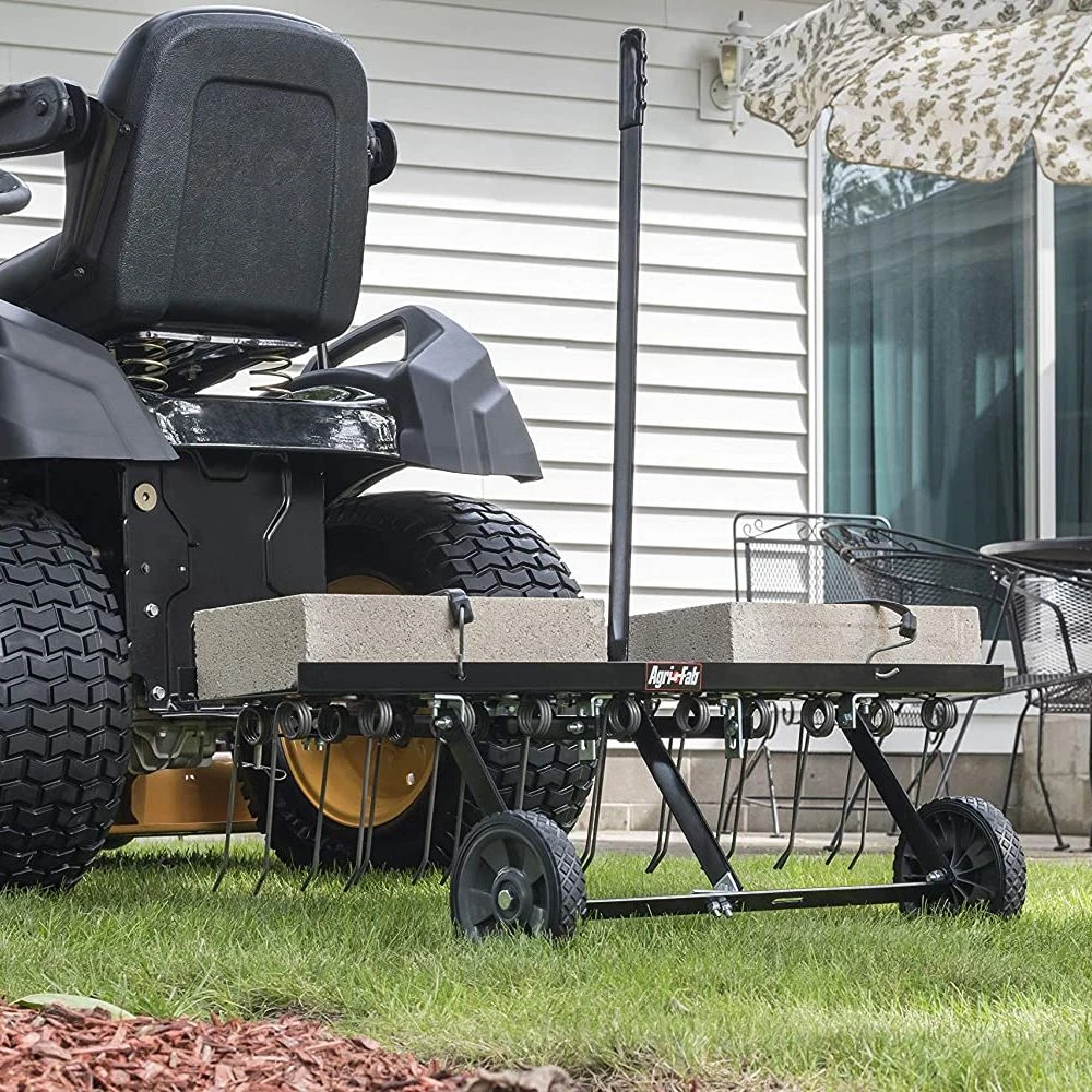 The Agri-Fab 45-0294 spring tine dethatcher does a gentle job of bringing matted layers of thatch and large clippings to the surface for a healthy lawn. Featuring a 102cm (40″) working width, it is equipped with 20 heat-treated, spring-loaded tines. Raising and lowering is easy thanks to the simple-to-use cantilever transport handle, which is accessible from the tractor seat. Up to 31.5kg (70lbs) additional weight can be added to the weight tray to give extra aeration depth when more tine pressure is required.