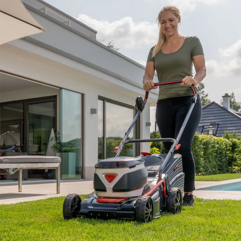 The AL-KO 36V 42.2 Li Comfort is a hand-propelled 36V cordless lawn mower equipped with a sturdy 42cm steel cutter deck.