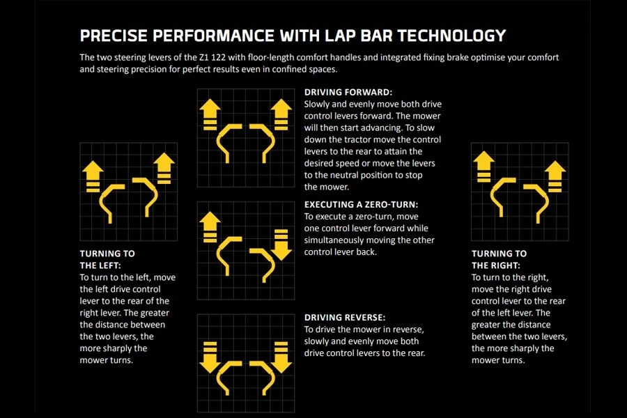 Lap bar controlled dual hydrostatic transmission and zero-turn manoeuvrability delivers the ultimate agility and control with smooth, precise handling so you can cut closer to obstacles and manage large, complex lawns without an issue. Cub Cadet’s RevTEK™ feature means you can also mow in reverse.