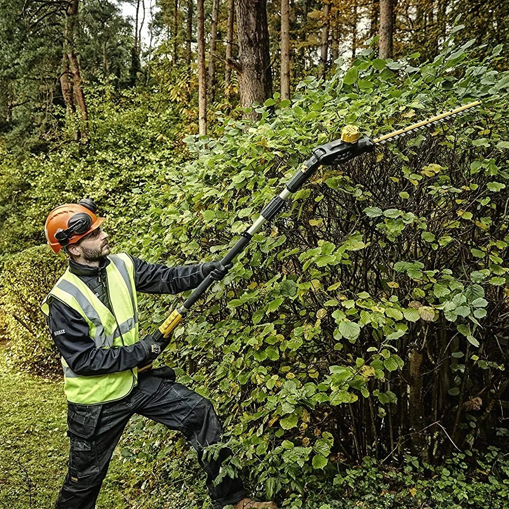 High power and exceptional battery life are just two of the advantages of the DeWalt DCMPH566 battery-powered pole hedge trimmer.