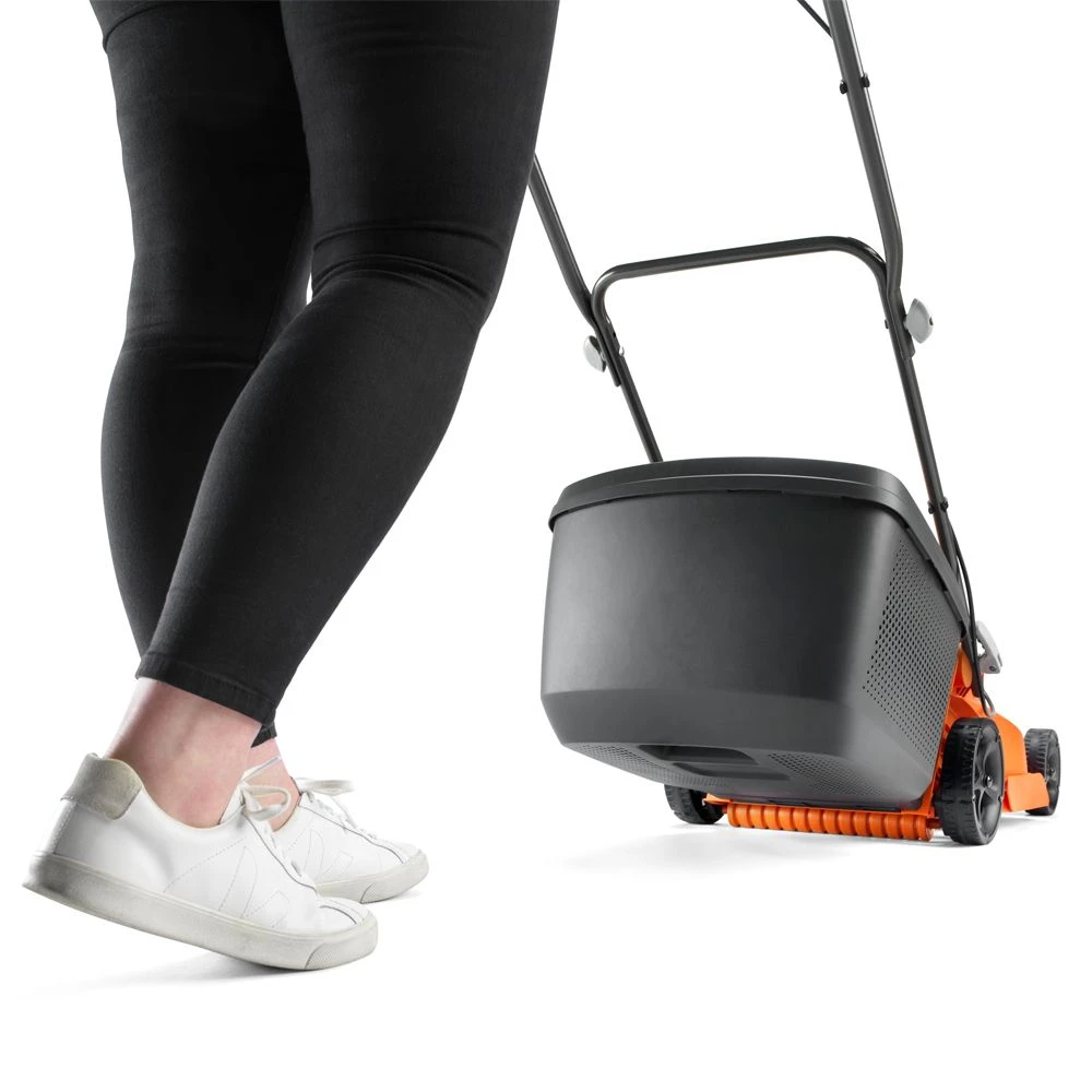 The cut grass is collected in a 35 litre capacity grass box with tongue design to make it easier to remove and dispose of the clippings, and features a full grass box indicator allows you to easily see when the grass box needs emptying.
