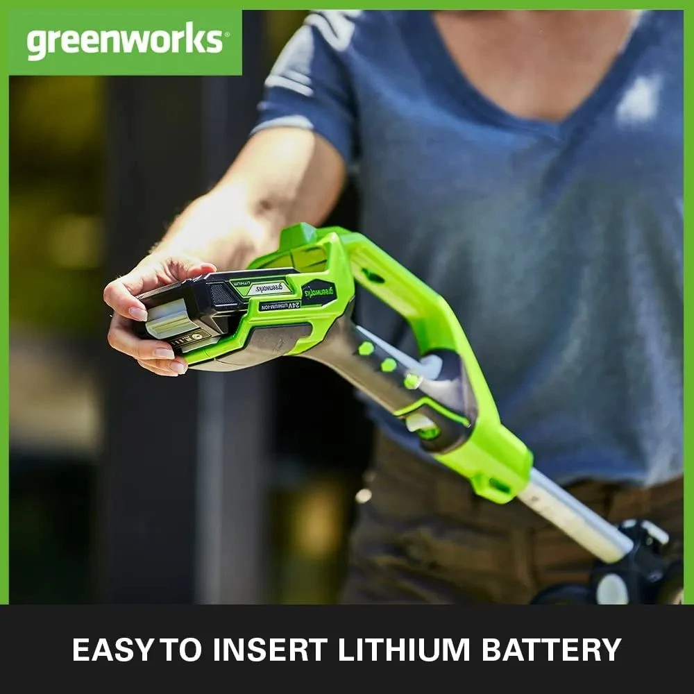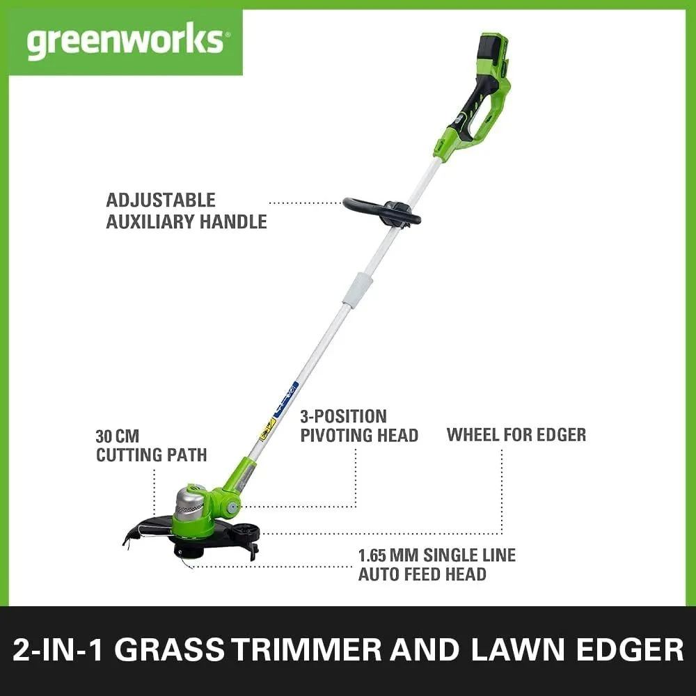 The GreenWorks G24LT30M Deluxe is a strong, flexible 24V 2-in-1 grass trimmer and lawn edger designed for smaller lawns. Powered by an advanced 24V lithium-ion battery, the trimmer offers high performance despite its compact size. Convenience is guaranteed with no fuel or electric cables to contend with, simply insert the battery and trim.
