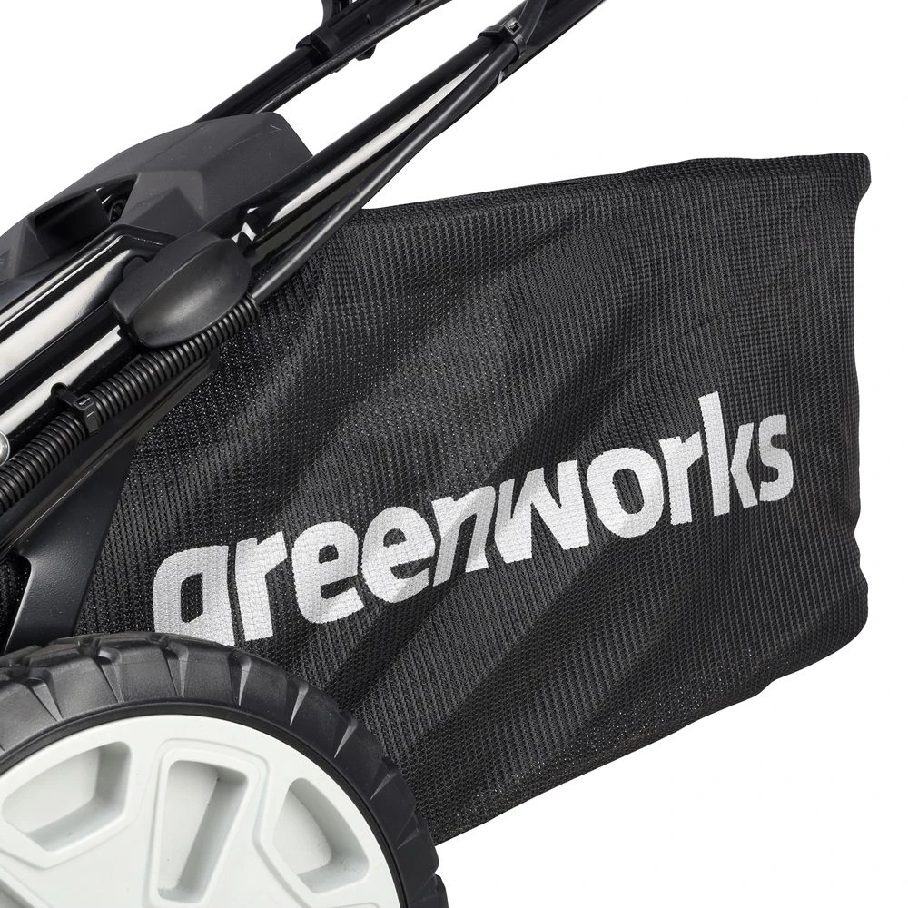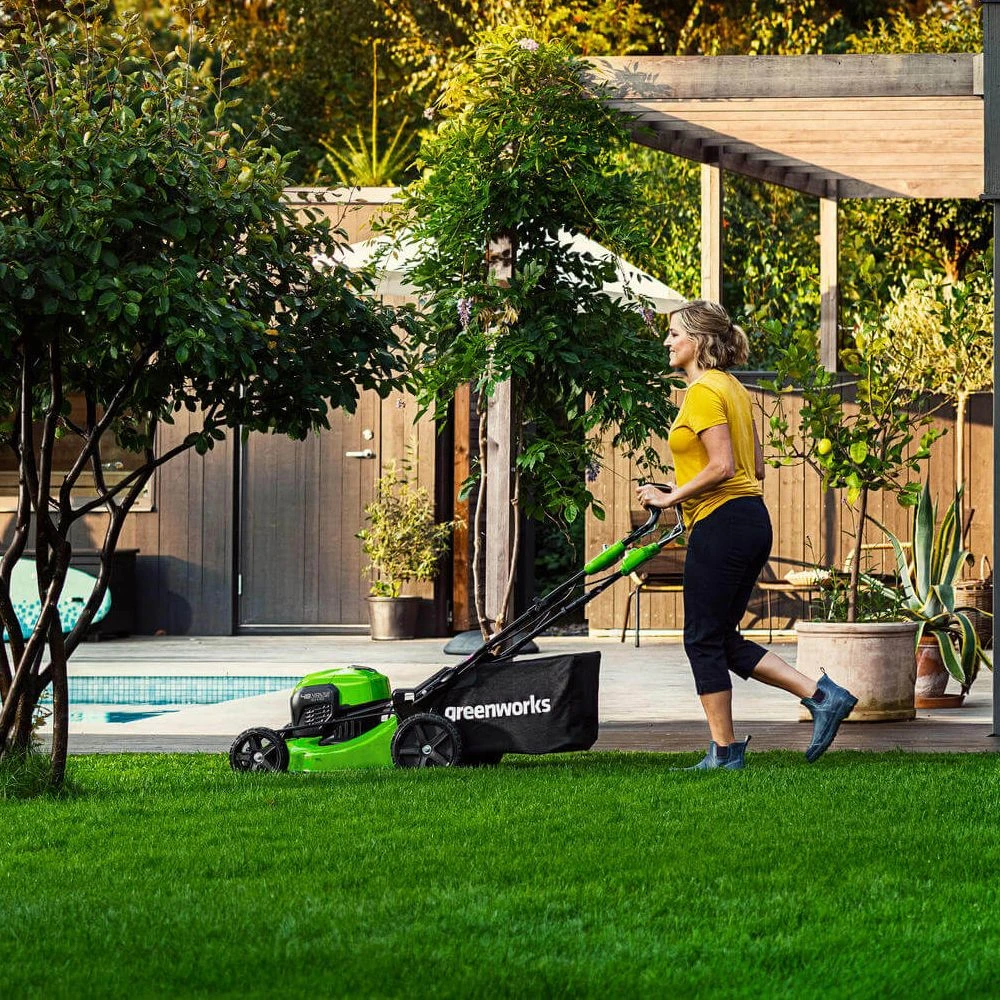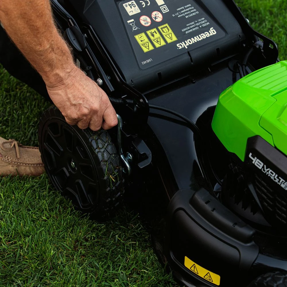 Employing two 24V 4Ah lithium-ion batteries (not included with bare tool) in parallel to unleash 48V of running power, this versatile GreenWorks 46cm cordless lawn mower has 4-in-1 functionality.