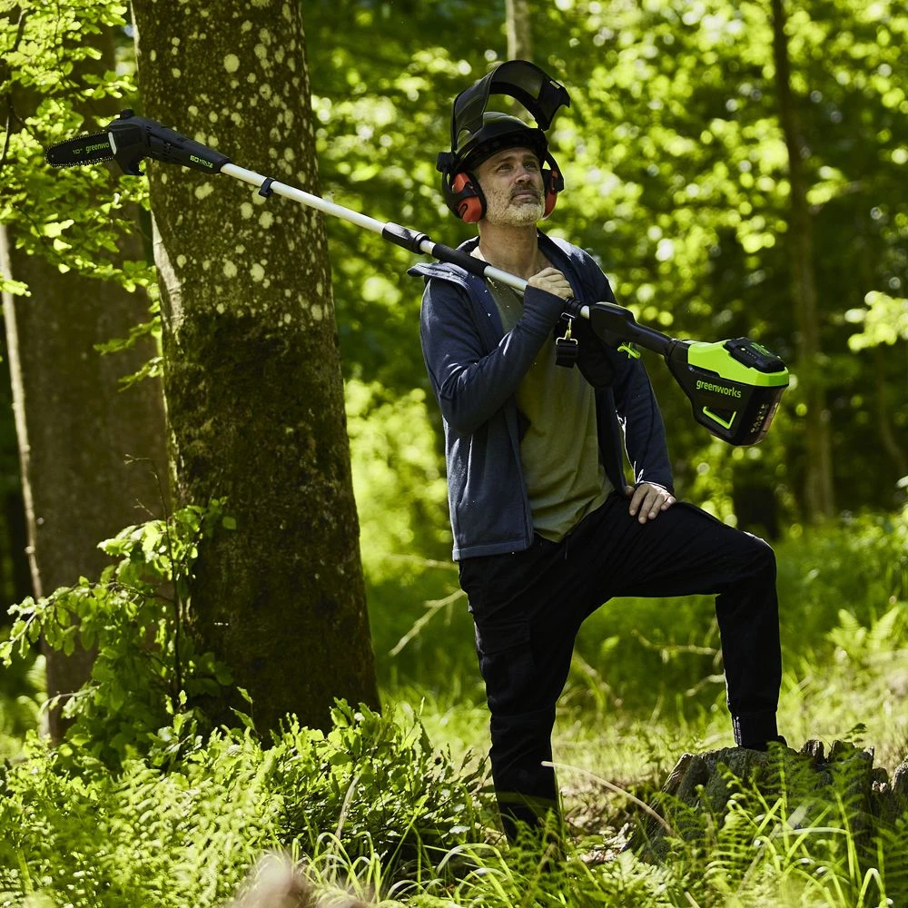 The result of the latest battery and motor technology with top-class chainsaw expertise, GreenWorks brings you the GD60PS25 60 volt cordless pole saw. Great news for demanding gardeners and professionals alike, the pole pruner features a brushless ‘DigiPro’ motor which delivers 30% more power and up to 70% less vibration than petrol, without the toxic emissions, noise and running costs.