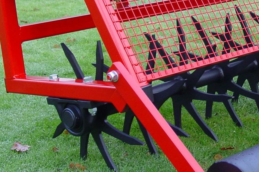 The aerator’s specially shaped tines pull at the ground on the way out, creating many small fractures to break down surface compaction. This is a very effective attachment for improving drainage, allowing air and nutrients to start their journey down to the roots.