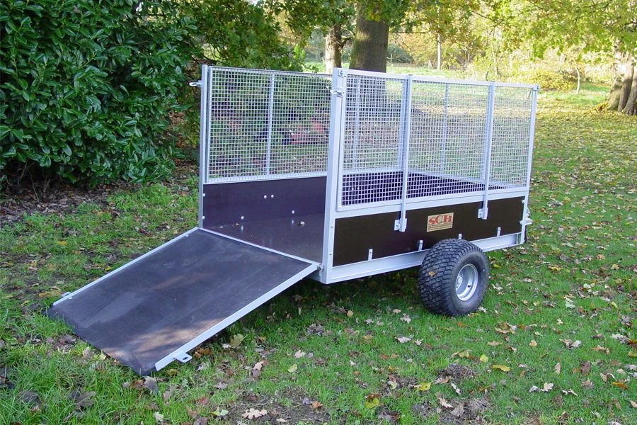 The trailer has a carrying capacity of 750kg, is supplied with fixed high mesh sides and is ideal for carrying animals or bulky loads such as straw, leaves, grass cuttings logs, etc. The wide 20 x 10-8 wheels give the trailer good flotation over unfriendly ground. A ramp tailgate is incorporated into the build. The ramp, floor and solid sides are constructed of a high quality phenol-ply.