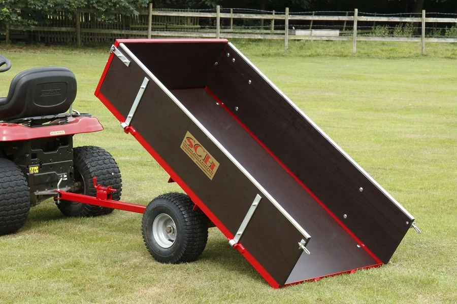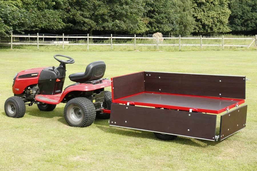 A good, strongly constructed timber bodied trailer for use behind garden tractors and ATVs. The sides are hinged and can be completely removed along with the tailgate if required to give a platform body with a fixed head board.