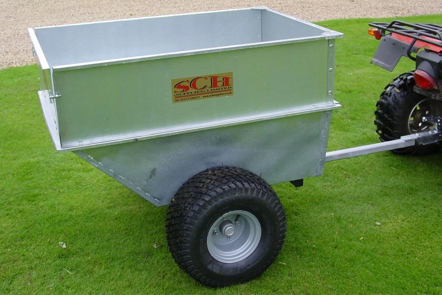 The SCH large capacity galvanised tipping trailer is fitted with flotation wheels with ball bearings and a 50mm ball hitch. The handle has been removed to prevent fouling the rear of the ATV and the tow bar has been extended to enable easier reversing.