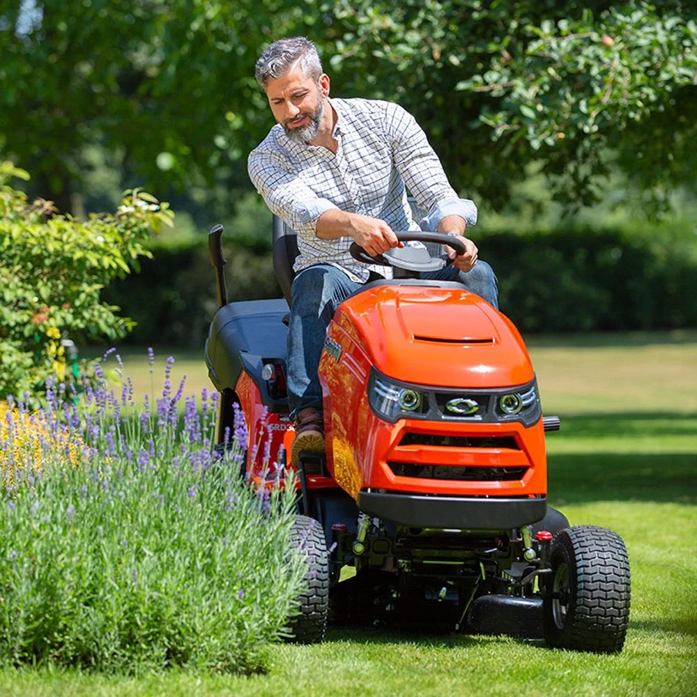Manoeuvrability is enhanced thanks to the tight 36cm turning circle, whilst a pivoting cast-iron front axle and large 22″ wheels allow a smoother ride over rough terrain. The solid steel front bumper adds durability.